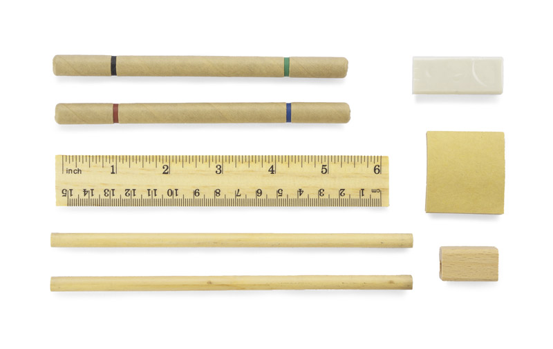 Ten kompleksowy zestaw zawiera wszystko, czego potrzebujesz do pracy biurowej czy szkolnej: dwa dwustronne długopisy (kolory czerwony, niebieski, zielony, czarny), dwa ołówki, linijkę, temperówkę, gumkę do mazania oraz karteczki samoprzylepne. Wszystkie elementy piórka wykonane są z materiałów ekologicznych, co potęguje wartość tego produktu.