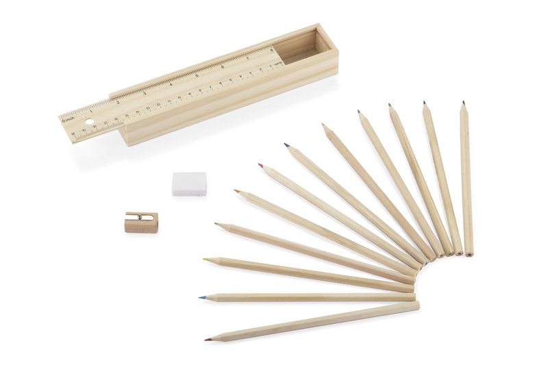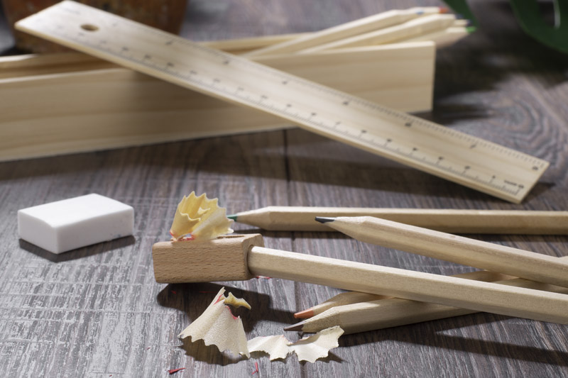 Piórnik składający się z dwunastu drewnianych kredek, funkcjonalnej linijki, gumki do ścierania oraz temperówki, stanowi kompletny zestaw do rysowania, malowania oraz pisania. Wszystkie elementy są starannie wykonane i idealnie współgrają z naturalnym wnętrzem tego poręcznego piórnika.