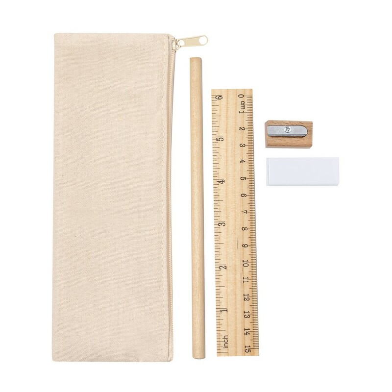 Poznaj wszechstronny i ekologiczny Zestaw szkolny, piórnik, ołówek, linijka, gumka i temperówka, który został zaprojektowany z myślą o młodych uczniach, ale także o środowiskowych potrzebach naszych czasów. Ten praktyczny zestaw zawiera wszystko, co potrzebne do codziennej nauki: ołówek, linijkę, gumkę oraz temperówkę, a wszystko to elegancko spakowane w piórnik z bawełny z recyklingu.